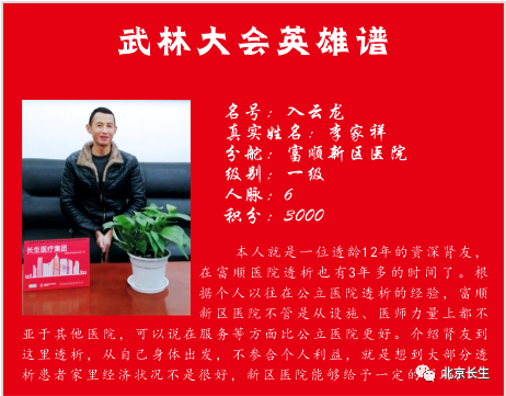 名号:入云龙 真实姓名:李家祥 分舵:富顺新区医院 级别:一级 人脉:6 积分:3000 李家祥本人就是一位透龄12年的资深肾友,在富顺医院透析也有3年多的时间了。根据个人以往在公立医院透析的经验,富顺新区医院不管是从设施、医师力量上都不亚于其他医院,可以说在服务等方面比公立医院更好。介绍肾友到这里透析,从自己身体出发,不参合个人利益,就是想到大部分透析患者家里经济状况不是很好,新区医院能够给予一定的帮助。